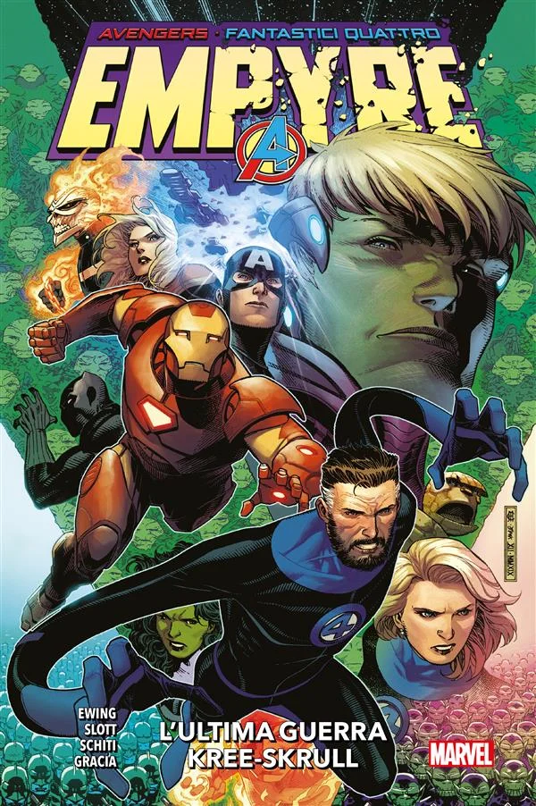 L’ALBA DI UNA NUOVA ERA E UNA GRANDE UNIONE! In storia, spesso si dice che i grandi imperi si forgino attraverso alleanze strategiche e campagne militari efficienti. Il nuovo, grande impero Kree-Skrull non fa eccezione: il nuovo sovrano Hulkling, re con il nome di Dorrek VIII, pacifica una volta per tutte le due razze e le riunisce sotto una sola corona per proteggerle dalla terrificante minaccia Cotati! Al Ewing (The Immortal Hulk) e il nostro Valerio Schiti (Guardians of the Galaxy), con il contributo “dietro le quinte” di Dan Slott (Superior Spider-Man), mettono in scena un grande evento crossover che cambia faccia al cosmo Marvel come non capitava da tempo! [CONTIENE: EMPYRE: AVENGERS (2020) 0, EMPYRE: FANTASTIC FOUR (2020) 0, EMPYRE (2020) 1-6, EMPYRE AFTERMATH: AVENGERS (2020) 1, EMPYRE FALLOUT: FANTASTIC FOUR (2020) 1]